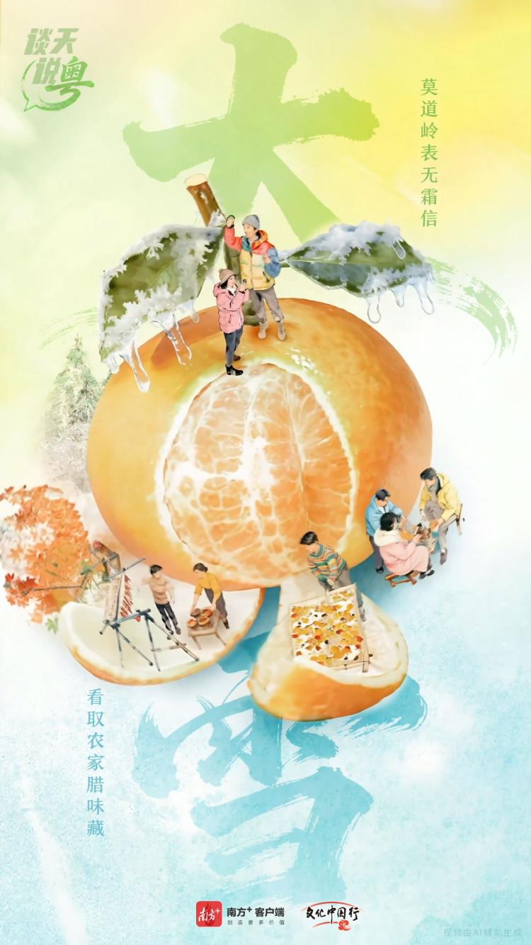 00:34 文化中国行·大雪|南方的冬天到了,甜甜温润的柑橘充满了甜蜜和温暖。 “飞雪正逢大雪节,明年将是丰收的季节。”今天,我们隆重介绍一下“大雪”节气。 《月令七十二时辰集》注:“十一月下了大雪,雪越下越大,雪越下越大。”广东清远三水瑶族镇与湖南蓝山县交界处的南部洼地,树枝上结满了冰,草地上晶莹剔透。南方+记者 段琪 摄 此时,北方一些地方雪花纷飞,但岭南却是另一番景象——青山、红花、绿叶、草木茂盛。在广州,toursIsta在粉色花海中打卡。南方+摄影师李汉辉 古人将大雪分为三个季节:第一个季节是冬天兰花不再歌唱,寒林中的喇叭鸟也哑了;第二次是老虎开始交配的时候,深谷里的老虎感受到日出,开始交配的时候;第三季是荔枝发芽的时候,兰草冲破严寒,在冰冻的土地上发芽。一幅蛰伏生命与萌芽生命的辩证画卷正在徐徐展开……深圳,日落时分,黑面琵鹭、斑嘴鸭、牛油果等大批冬候鸟已抵达深圳湾岸边。虽然广东大部分地区很难看到雪花飞舞,但从南方吹来的寒风依然给这片土地带来了冬天的讯息,是“藏冬”的标志。广东清远连州蔡鑫在收获季节辛勤劳作。南方+记者 黄进 摄 广东的冬天既严酷又温和——在粤北山顶寻找冰风。清远金子山、韶关乳源等高寒山区,雾凇冰风晶莹剔透,给南方带来了几分北国冬天的美景。当强冷风吹到广东韶关时,常年难得一见的冰雪雾凇景象。图片来源:韶关旅游 生活在湿地滩涂上的候鸟。黄鹭、黑脸琵鹭迁徙南粤。它们扑腾的翅膀为冬季湿地注入了生机;广东湿地是候鸟的天堂。图片来源:广东省林业局 潮汕城乡人民祈求身体健康,祭祀鸡、鸭、鱼、红桃糕等祭品,祭天祭祖。在传统仪式上,他们祈求五谷丰登、阖家团圆……挂在杆子上、挂在绳子上,是广东人对品味的坚持,也是刻在DNA里的生活智慧。或者来源:东莞发布。广东的冬天有别样的热气和风味——屋檐下蜡香四溢,家家户户都晒着腊肠腊肉。暖胃祛寒,是秋冬季节的滋补佳肴;广东人吃一顿御寒饭可以不穿羽绒服,但不能没有炖羊肉。橘子味甜,有吉祥之意。德清贡橙、四会糖橙、连江红橙等,其果肉甘甜多汁,润喉滋补。产于广东江门新会的陈皮,多年生陈皮,素有“一两陈皮,一两黄金”之称,是当地的宝果。南方+记者 张友琼 摄。雪节不是严寒的开始,而是暑雨的开始。尝试搭配咸肉、柑橘和橙子,在火炉周围甜蜜温暖的地方,体验独特的冬季这片土地的温暖。策划:王希勇、李赫、刘平云 统筹:季蓓、李培、何永荣、胡良刚、张喆、张锡录 执行:刘子奎、李恒丹、黄奇帆、张畅、张瑞伟 设计:张畅 动画:李婷、张瑞航:子明、李景贤、黄坤元