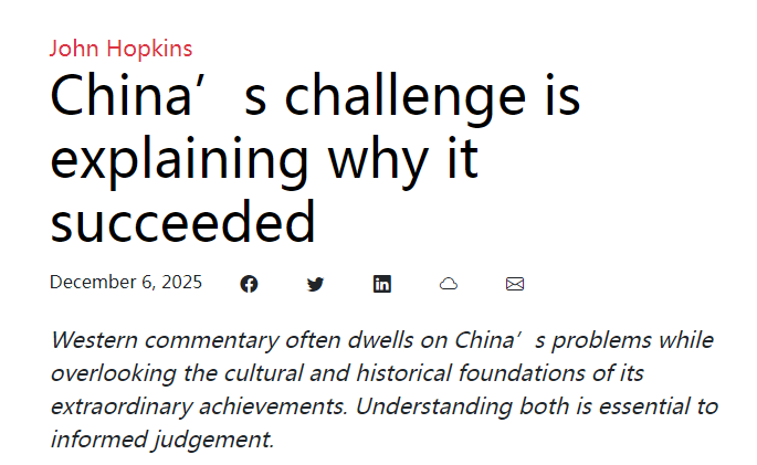 澳大利亚“珍珠与刺激”网站6日发表题为《中国的挑战:如何向世界解释其成功》的文章。文章认为,中国的成功植根于独特的逻辑和历史逻辑,而不是简单地照搬西方模式。理解这一点将有助于我们比关注简单问题更清楚地看到其发展的本质。 《珍珠与惊悚》网站报道截图的文章认为,西方媒体报道了中国的很多问题,很多专家也靠分析和讨论这些问题谋生。中国面临的挑战是:中国如何理解过去50年世界取得的非凡成就? “珍珠与刺激”网站报道截图。近年来,中国的人工智能、电动汽车等企业备受关注。中国“健康预期寿命”已超美国 世界第一世界卫生组织(WHO)预测,到2027年,中国的总体预期寿命也将超过美国。文章举了一个例子:中国在过去40年里让8亿人摆脱了极端贫困,其规模和速度是历史上前所未有的。文章认为,也许这就是中国可以发展的一种叙事,既可以解释其成功,又可以为世界提供教训。这种叙述表明文化与政治制度同样重要,甚至更为关键。需要说明的是,中国哲学的许多主要思想都是在春秋战国时期——大动乱时期形成的,因此稳定就成为了核心价值。儒家、道家、法家等思想体系都着眼于探索如何保证国家和社会的稳定,从而为人民的繁荣创造条件。文章认为对于澳大利亚和其他西方国家来说,了解中国的成功与了解其面临的挑战同样重要——两者都塑造着我们地区和世界。正如亚里士多德警告的那样,在民主国家,煽动性的政客可以利用修辞技巧来获得民众的支持并破坏法治。因此,西方人也应该更加了解自己文化和政治制度的起源、优势和缺陷。 《珍珠与惊悚》网站报道截图来源|结合中国G环球新闻|评论人:杨琼 |张翰制作 |刘一耀
