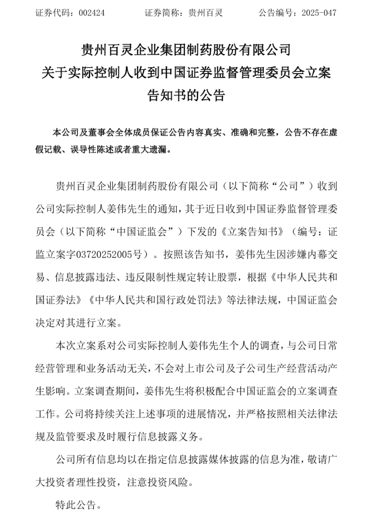 海报新闻记者刘静一报道,12月3日晚,贵州百灵企业集团制药股份有限公司(以下简称“贵州百灵”)发布公告称,公司实际控制人姜伟涉嫌内幕交易、非法披露信息、违反我国严格的股票转让规定,证监会决定对其进行立案调查。公告截图 贵州百灵在公告中表示,本案的立案仅针对实际控制人姜伟,与公司日常管理及经营活动无关。该事项不会对上市公司及其子公司的生产经营产生影响。调查期间,姜伟将积极配合证监会的调查。公司将持续关注此事进展,并将严格遵守相关法律法规和监管要求,及时履行信息披露义务。上述公告发布两小时后,贵州百灵官方微信发布了一条题为《姜伟董事长致贵州百灵全体同仁的一封信》的推文。姜伟向贵州百灵全体同仁致信。姜伟在信中表示:“我因涉嫌内幕交易等行为而受到调查。作为公司董事长和大家的同事,我认为有必要尽快让大家了解此事。我将全力配合证监会的调查,坚信监管部门会依法给予监管客观公正的结论。实践中,监管调查最终认定不存在违规行为的情况很常见。”违规行为。各位同事,请保持冷静,不要太担心。”姜伟提到,贵州百灵和他自己近年来一直陷入困境:2024年上半年,公司股票受到其他风险警示;2025年,公司完成退出,一切发展重回正轨。然而,作为公司控股股东,却被华创证券以无钱为由起诉大额。该推文下,不少网友纷纷留言。自称是贵州百灵员工的留言“江总加油”、“百灵加油”等自称是贵州百灵供应商的网友评论称,“贵州百灵从不拖欠工资,公司领导平易近人。”在提起诉讼之前,贵州百灵成立于1999年,2010年作为“第一股”上市。苗药股份”。实际控制人为姜伟。公司整合致力于苗药的研发、生产和销售。其独家苗药产品银丹心脑通软胶囊、克速丁糖浆及胶囊,以及非苗药产品景安胶囊、小儿柴桂解热颗粒是公司的主要盈利产品;上述产品均在心脑血管、止咳、儿科药品市场占有一定的市场份额。贵州百灵官网 姜伟出生于1961年及其后——历任安顺制药厂厂长、贵州百灵药业有限公司董事长、贵州百灵企业集团制药有限公司董事长、贵州百灵企业集团制药有限公司董事长。姜伟自2007年12月25日起担任公司董事长;自2024年12月13日起,担任董事会秘书。姜伟 图源贵州百灵官网 姜伟提到信中称,2025年,作为公司控股股东,他被华创证券针对巨额资金进行无理起诉,且此时立案,正值其与前救助方华创证券陷入重大法律纠纷的关键阶段。今年8月15日,华创云鑫数字科技股份有限公司(以下简称“华创云鑫”)发布公告称,子公司华创证券向贵州百灵主要股东姜维及其关联方提起救助计划履行纠纷,并收到当地法院收到的股票质押案件纠纷。两起案件涉案金额合计高达17.61亿元,涵盖救助计划本金14亿元,股票质押融资本金3.61亿元,以及相应的固定收益、违约金等。及其他相关费用。华创云信公告截图 华创云信表示,两项救助计划分别将于2022年7月和2024年3月到期,股票质押将于2024年8月到期。华创证券多次鼓励姜伟及其关联方履行合同,但相关恩查并未兑现合同。义务也没有提供切实可行的解决方案。为维护自身合法权益,华创证券向法院提起诉讼。据此前媒体报道,姜伟针对该纠纷提起反诉,要求华创证券继续履行合同,处置其持有的全部1.6亿股贵州百灵纾困股,并赔偿贵州百灵及其自身因华诚马里证券报告华诚认购等报告错误而造成的股票减值损失。对此,华创证券发布声明目前,相关民事纠纷已进入司法程序,期待并相信司法机关会做出客观、公正的裁决。贵州百灵2025年第三季度财务报告显示,截至2025年9月末,姜伟直接持有公司17.55%的股权,为公司实际控制人;华创证券两个资产管理计划合计持有公司11.54%的股权。上榜之路15年:ST删减后业绩跌宕起伏。 2010年上市后,贵州百灵的业务规模和业绩不断提升,股价也相应上涨。 2010年,姜伟的年薪达到88.5万元,其他高管的年薪约为40万元。当时,公司共有带薪员工2268人,工资支出4801.5万元,平均工资2.11万元。 2010年起至2018年,公司业绩呈现平稳增长:2010年实现营收8.64亿元,净利润1.58亿元; 2018年营收增至31.37亿元,净利润达5.63亿元。 2019年至2023年,公司业绩进入下滑趋势:2019年实现营收28.51亿元,净利润2.85亿元;到2023年,虽然公司营收增至42.63亿元,但净亏损4.15亿元。 2024年5月6日,贵州百灵2023年度财务报告被天健会计师事务所出具了否定意见的《内部控制审计报告》。深交所实施“其他风险警示”,股票简称变更为“ST百灵”。根据《深圳证券交易所股票上市规则》,上市公司给予百年无权发表意见或否定意见。如果内部控制审计报告或者鉴证报告被发现的,交易所将对其股票实施其他风险警示。 2024年11月,贵州百灵本身因涉嫌信息披露违规被中国证监会立案调查。调查结果尚未公布。 2024年全年,贵州百灵实现营收38.25亿元,净利润3400万元,实现扭亏为盈。为了进一步降低管理成本,姜伟主动放弃了当年的工资;其弟江勇等公司高管年薪约70万元。当年,公司有酬员工增至6586人,工资、奖金、津贴、补贴支出总额5.48亿元,人均工资增至8.3万元。今年6月18日晚间,ST百灵宣布,2024年,围绕“摘帽”的主要任务公司采取了全面修复完善内部制度、强化内部审计管理职能、新设合规管理部门等一系列整改措施,目前已完成整改。根据上市规则,上市公司完成内